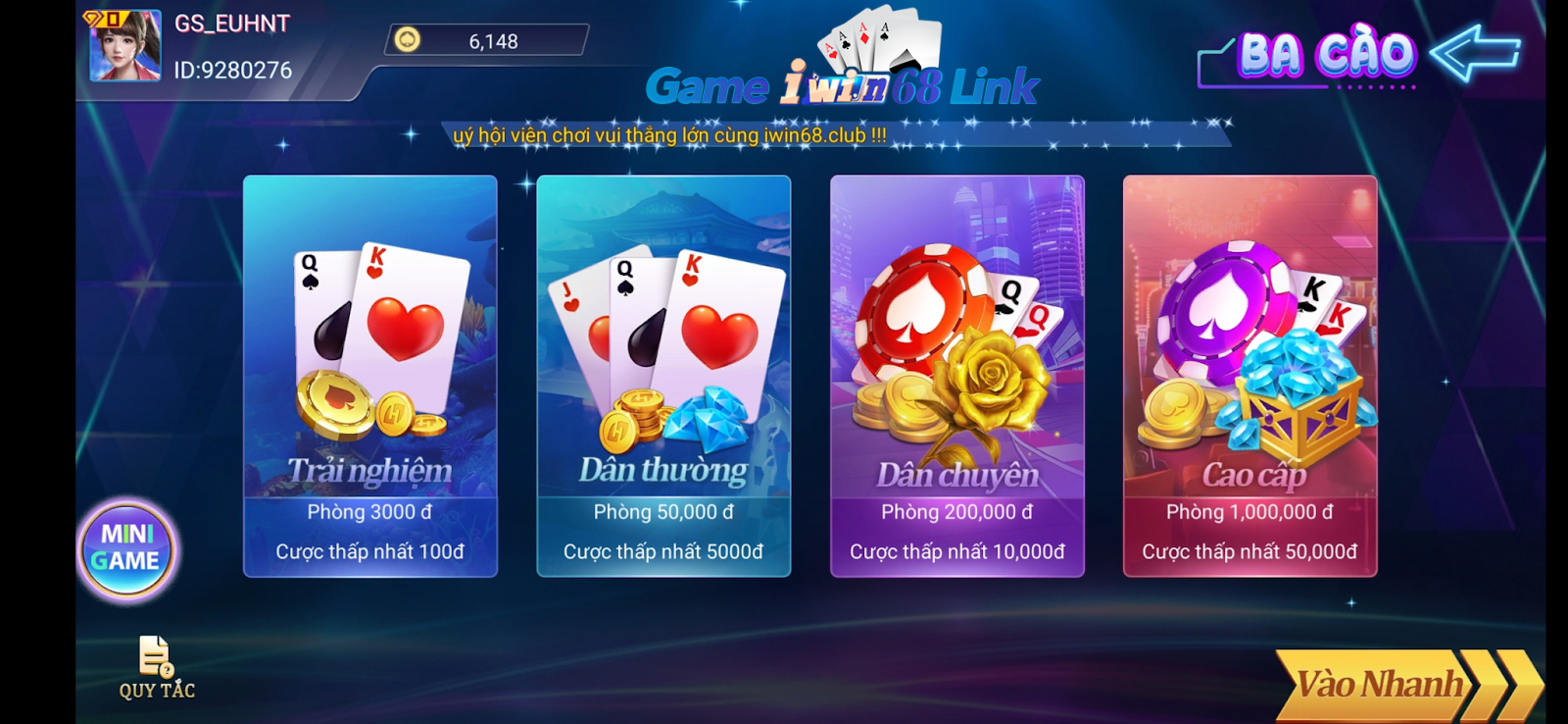 Bài ba cào có thể nói là một trong sảnh game bài thu hút nhiều người chơi tham gia cá cược nhất hiện nay tại nhà cái IWIN68. Hiện nay có tới 4 phòng chơi bài cào ba cây tại IWIN68 với đa dạng cấp độ tiền cược giúp người chơi có thể dễ dàng lựa chọn phòng phù hợp với tài chính của mình để tham gia chơi.