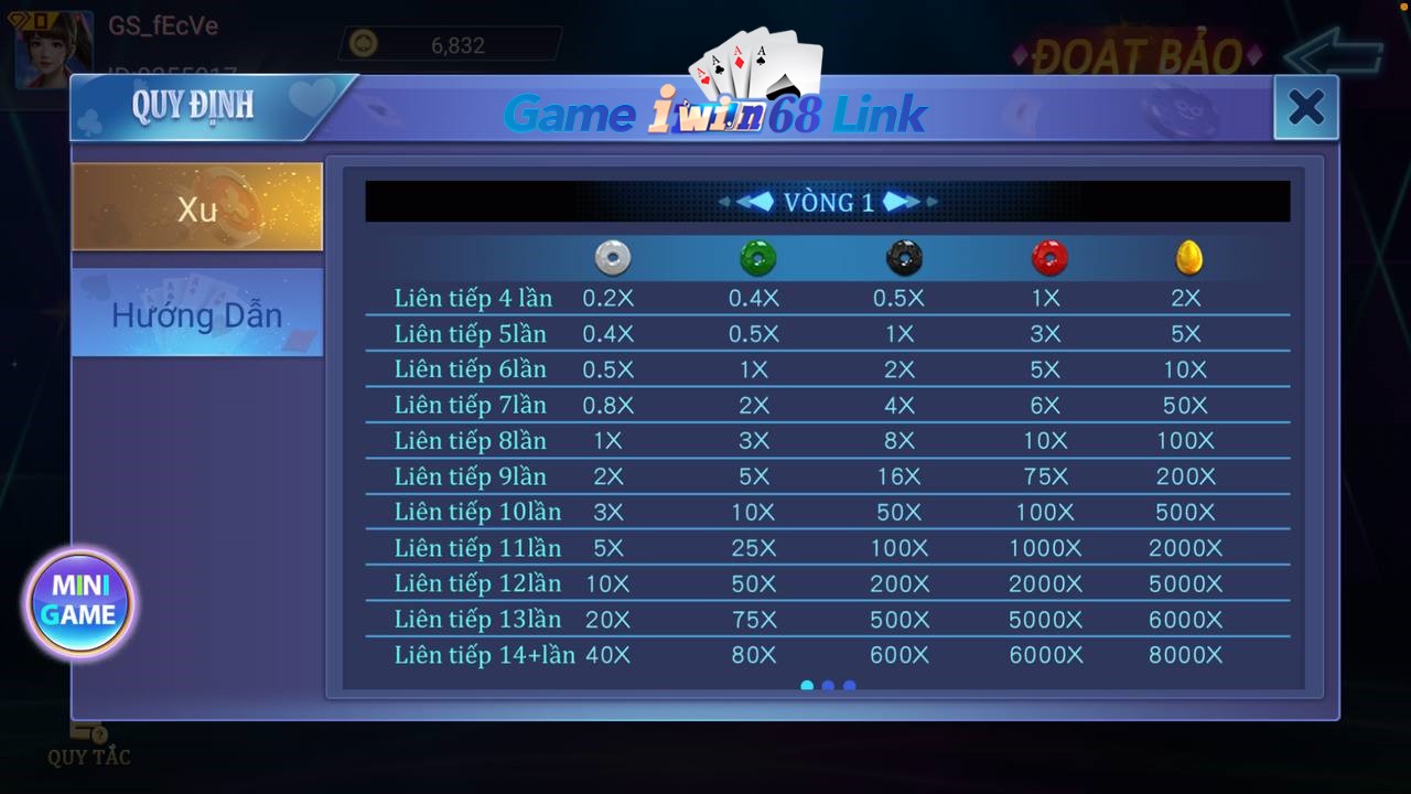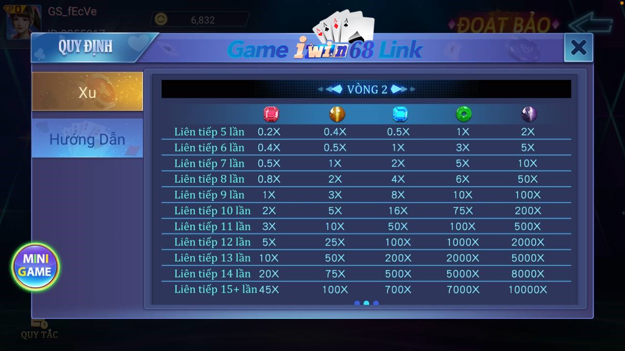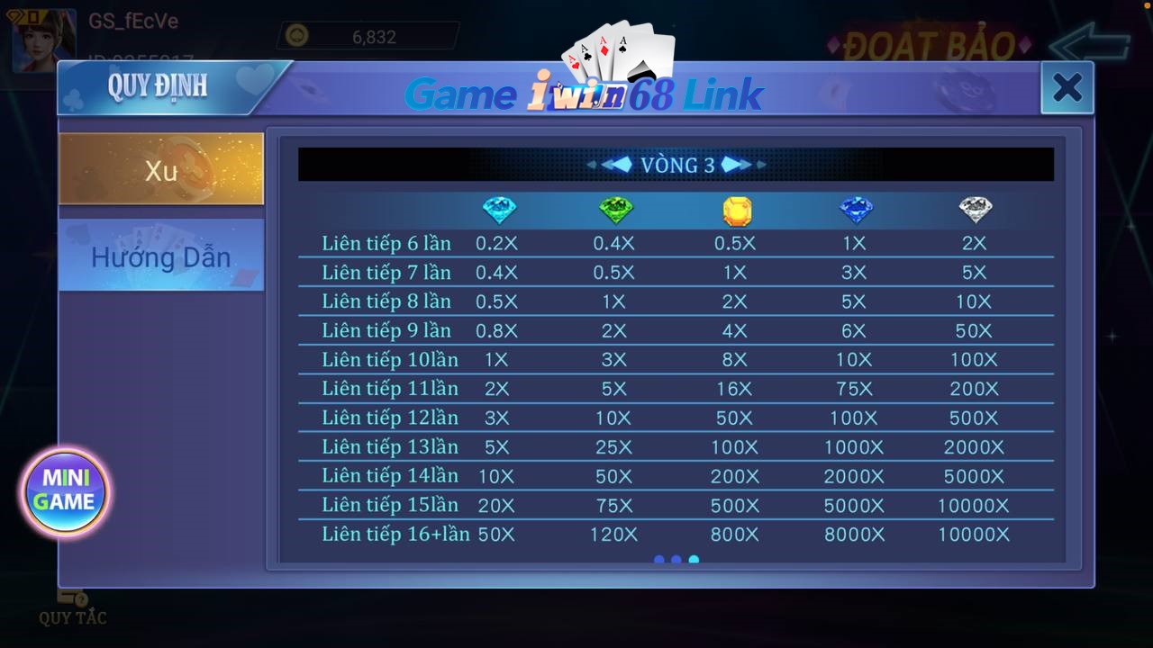 Đoạt Bảo IWIN68 sẽ đưa bạn trải nghiệm với 3 vòng chơi. Với từng vòng chơi thì việc nhận các ký hiệu khác nhau, số lần liên tiếp khác nhau thì số nhân tiền thưởng cũng khác nhau.