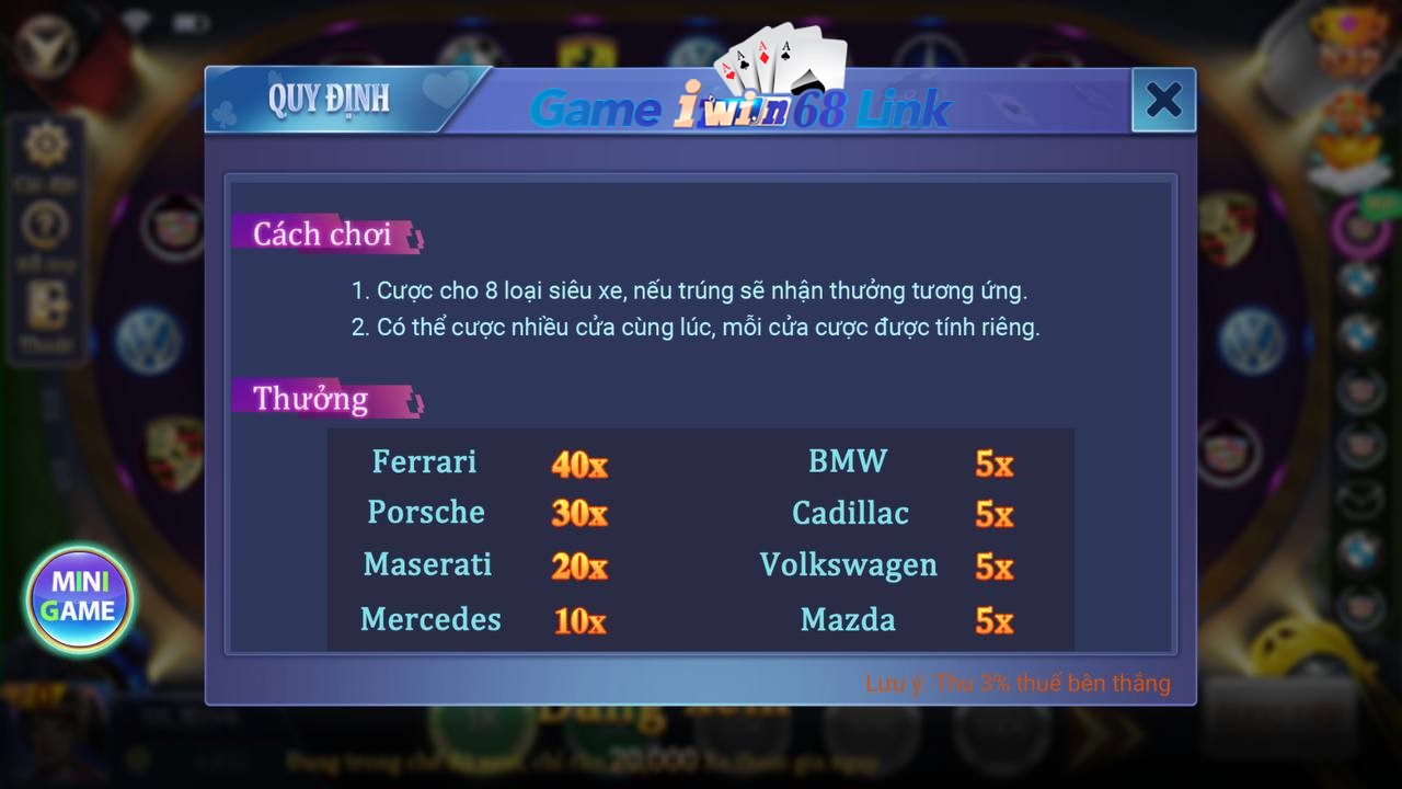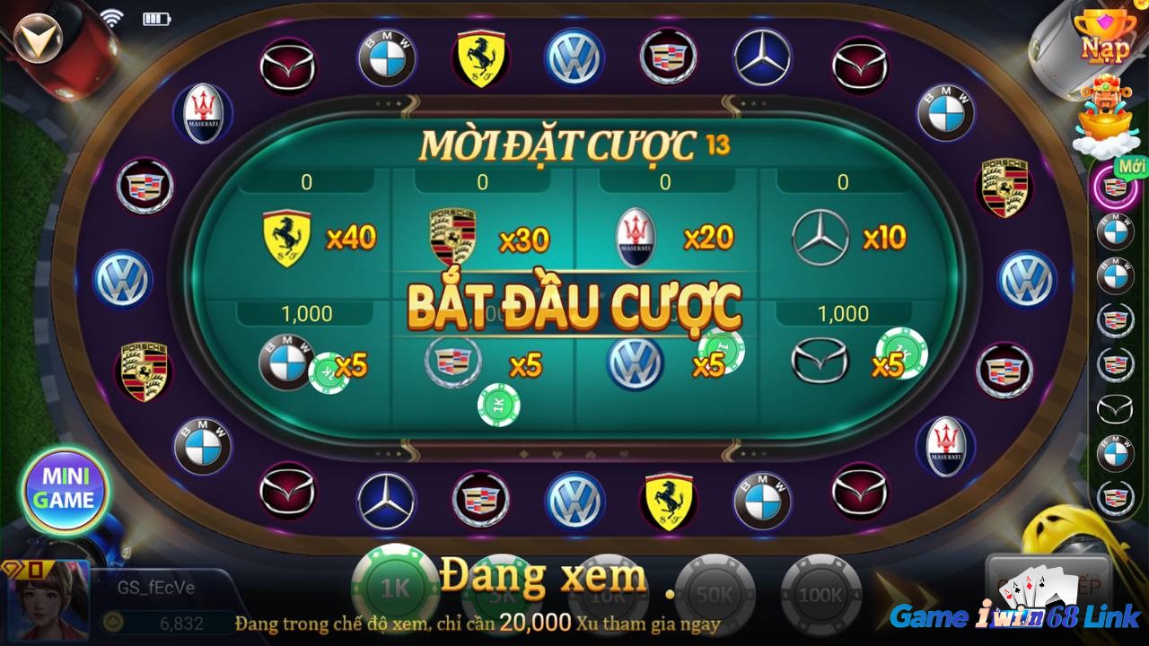 Lấy nguồn cảm hứng  từ những hãng xe ô tô đắt giá trên thế giới và mong muốn đáp ứng nhu cầu của người chơi với đa dạng các hình thức chơi cá cược; IWIN68 đã chính thức cho ra mắt tựa game Siêu Xe đến với người chơi của mình. Cách chơi của hình thức chơi này tại IWIN68 đơn giản, kết hợp cùng giao diện đẹp mắt và âm thanh cuốn hút nên nhận được rất nhiều thiện cảm từ người chơi.